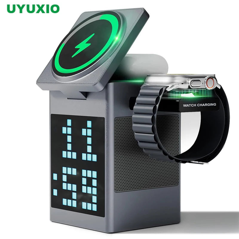 Transform your nightstand with the UYUXIO 3-in-1 Magnetic Wireless Charging Station, exclusively at Basketol. This all-in-one bedside hub combines 30W fast wireless charging for iPhone, AirPods, and Apple Watch, premium Bluetooth speaker, digital alarm clock, and stunning RGB pixel display. Featuring Qi-certified magnetic charging, built-in cooling fan, charging indicators, and USB-C power delivery, it's perfect for decluttering your nightstand, bedroom organization, office desks, and anyone who wants a sleek, multifunctional charging solution that does it all.