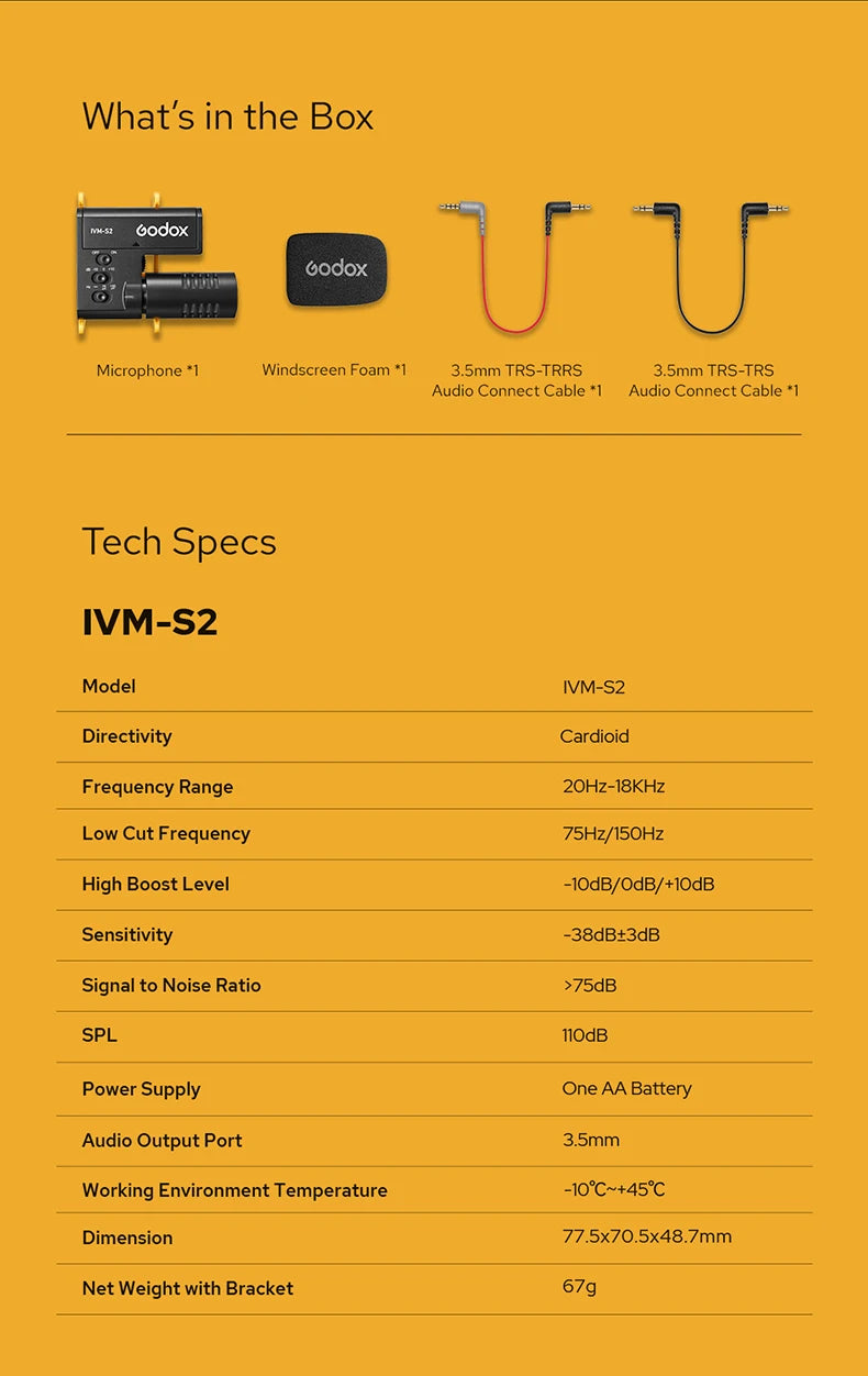 Godox IVM-S2 Compact Shotgun Mic 67g 21-Day Battery Cardioid 3-Gain Low-Cut | Basketol