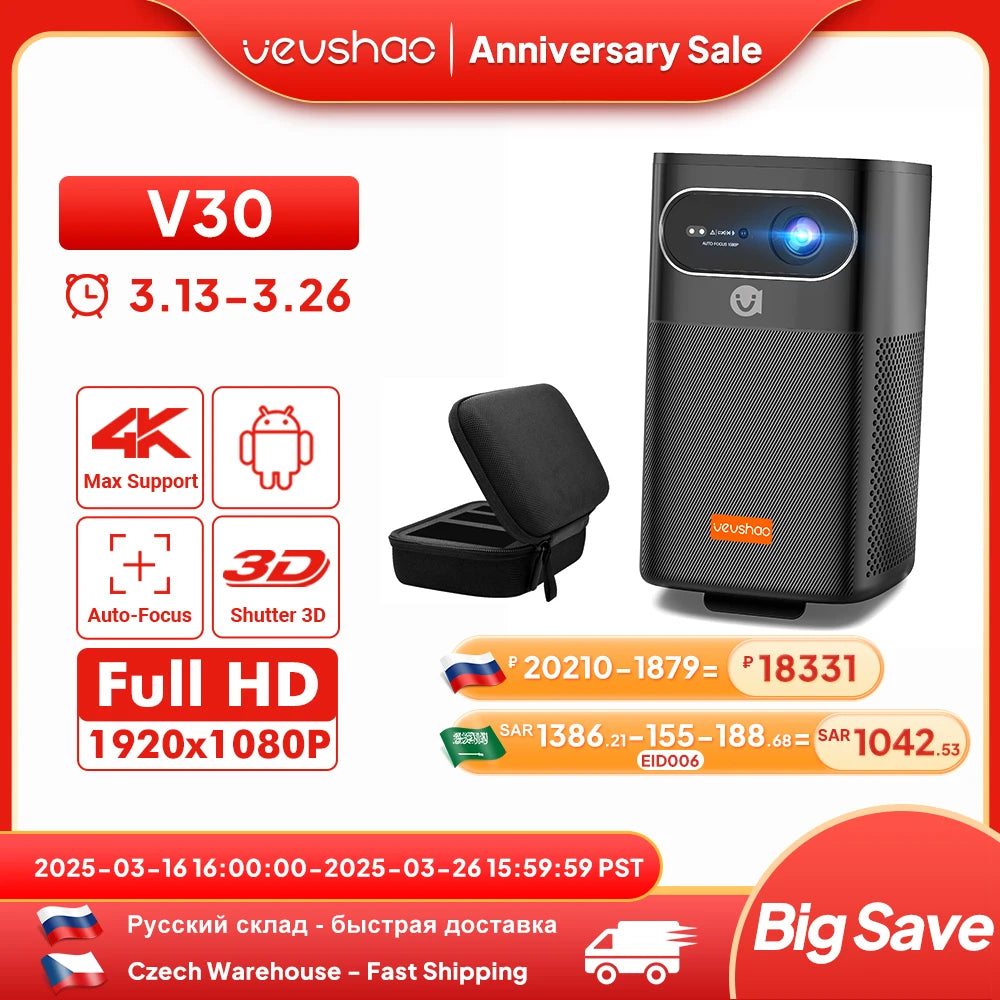 The VEVSHAO V30 Mini Projector is the perfect portable solution for high-quality home entertainment, business presentations, or outdoor movie nights. With its Full HD 1080P resolution support, Active Shutter 3D technology, built-in 15000mAh battery, and a host of smart features, this projector is compact yet powerful, ensuring an immersive viewing experience wherever you go.
