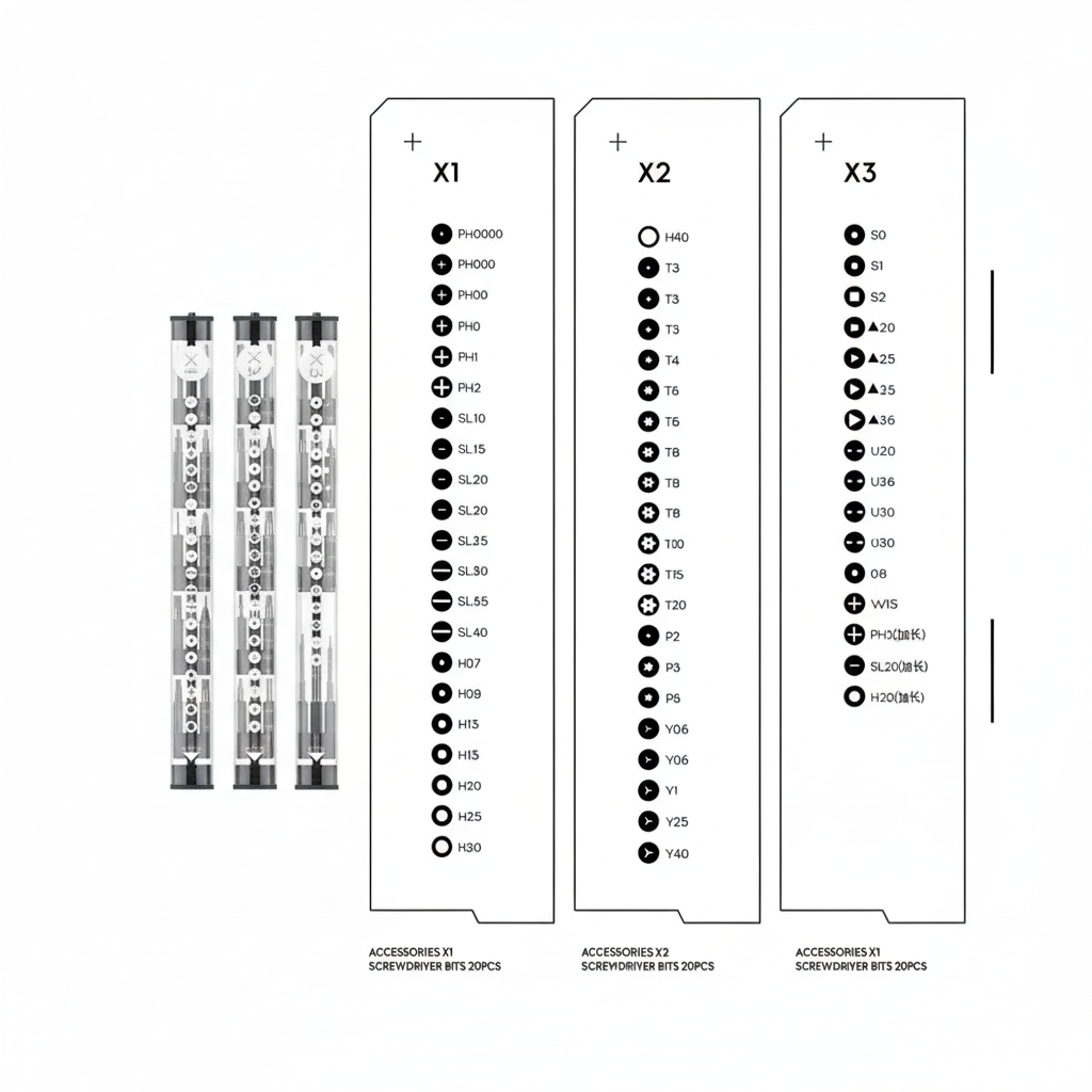 A: The kit includes a comprehensive range of precision bits: Phillips (PH000-PH1), Flathead, Torx (T2-T10), Hex, Pentalobe (P2-P6), Tri-wing, Y-type, U-type, and specialty bits for electronics, smartphones, laptops, and gaming consoles.